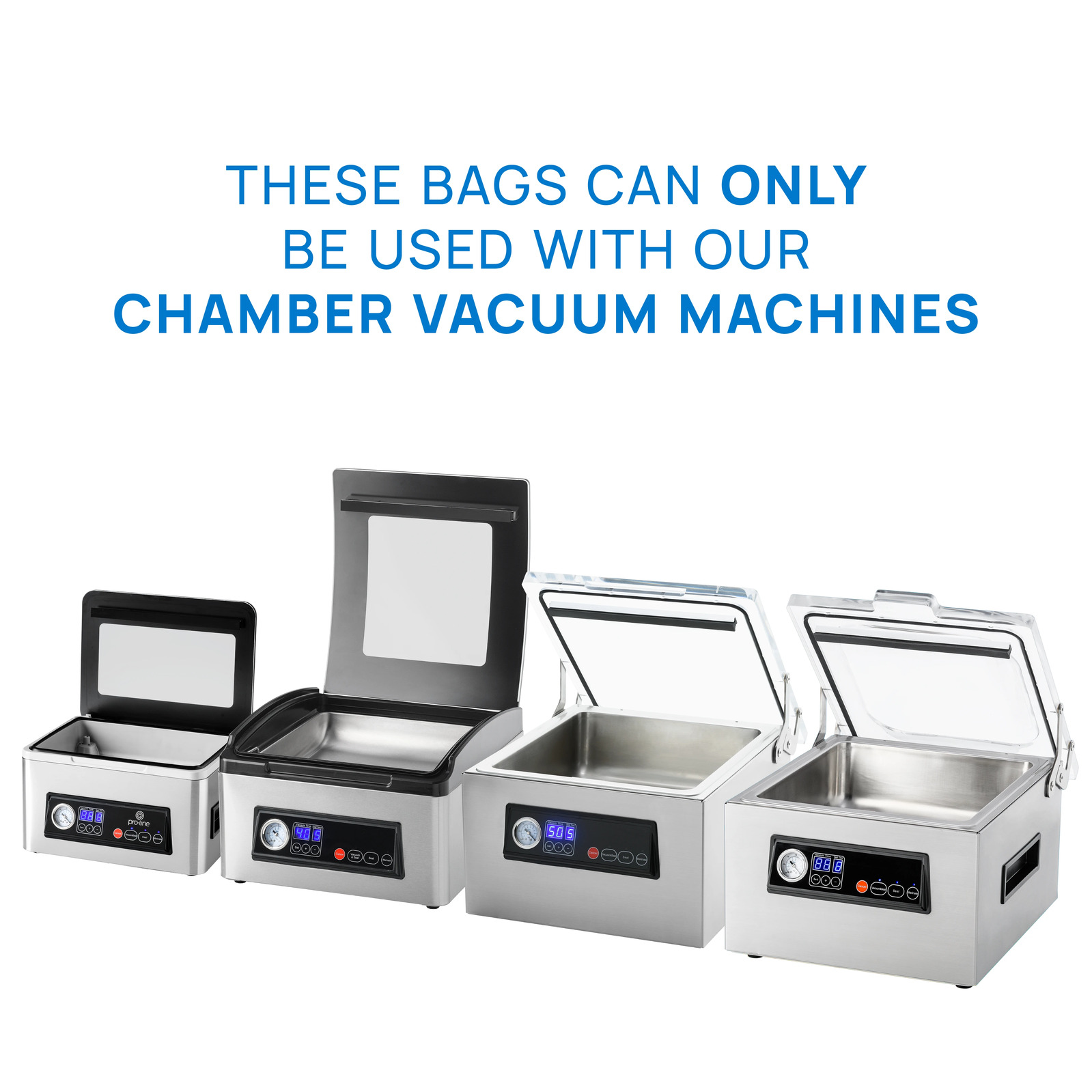 *PLEASE NOTE: These bags are ONLY FOR CHAMBER VACUUM MACHINES. They are smooth on both sides as the air is evacuated from the entire chamber, and not extracted from the bag. Therefore these bags are ONLY suitable for the Chamber machines. They will not work with vacuum sealing machines which are “out of chamber” or “external” as they require bags with the cross air venting technology.
